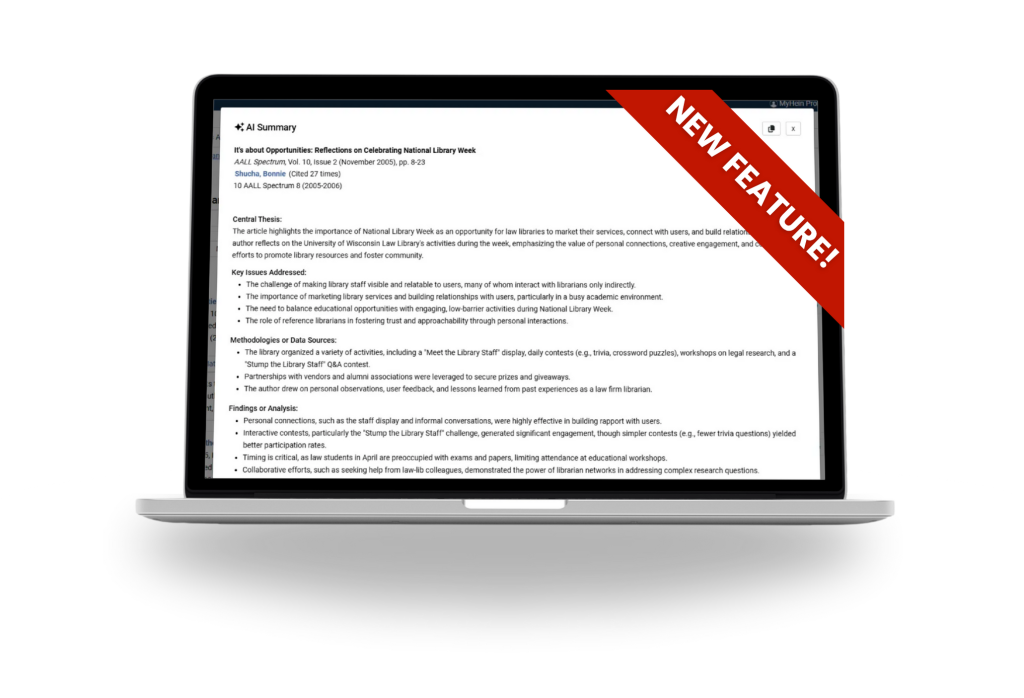HeinOnline, a product of William S. Hein & Co., Inc., is pleased to announce the release of its newest feature: Article Summaries (Powered by AI). This feature uses artificial intelligence to help researchers cut through the noise and get straight to the heart of an article, saving time and streamlining the path to meaningful discovery.